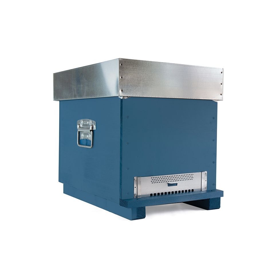Arnia Cubic da 8 Favi solo Nido con fondo a rete antivarroa, coprifavo alto con disco a 4 posizioni, coperchio piano ricoperto in lamiera zincata, maniglie, angolari, porticina metallica, lamiera forata, vassoio in lamiera zincata. L'arnia è montata con viti e verniciata con vernice ecologica all'acqua.